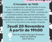 Le 20 novembre c'est la journée internationale des droits de l'enfant, anniversaire de la Convention internationale des droits de l'enfant de 1989. C'est aussi le TDoR, le Trans Day of Remembrance, jour du souvenir trans, en hommage à toutes les victimes de la transphobie dans le monde. Rassemblement aujourd’hui à l’appel du collectif Retour vers la friture, du QG-centre LGTQIA+ 22, et du Planning familial 22, – à partir de 19h, Sous les Halles Georges Brassens, place du Martray à Saint-Brieuc.