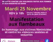 Actions du 25 Novembre dans le département - Journée internationale de lutte contre les violences faites aux femmes et aux minorités de genre Manifestation au flambeaux : 18h devant l'ancien restaurant universitaire (près du pont d'Armor) à Saint-Brieuc Et aussi : rencontre, expo, conférence débats et ciné-débats dans tout le département.