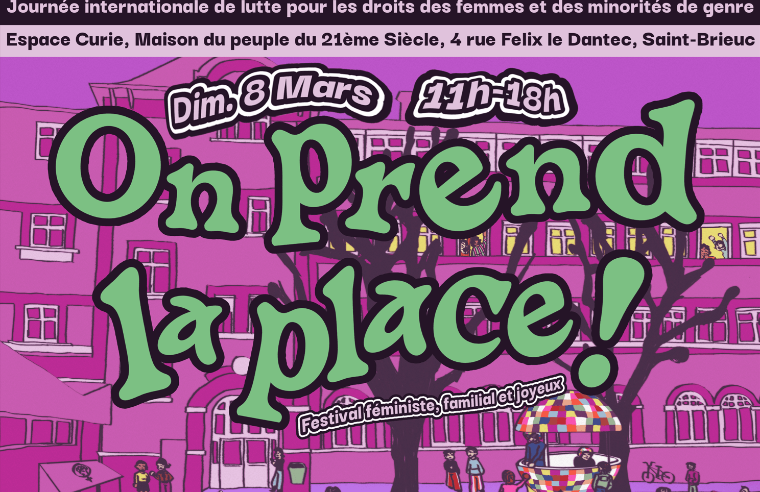 Le 8 mars : On prend la place ! Festival féministe, familial et joyeux (Gratuit) Dimanche 8 Mars 2026 de 11h à 18h Espace curie - Maison du peuple du XXIème siècle – 4, rue Félix Le Dantec – Saint-Brieuc