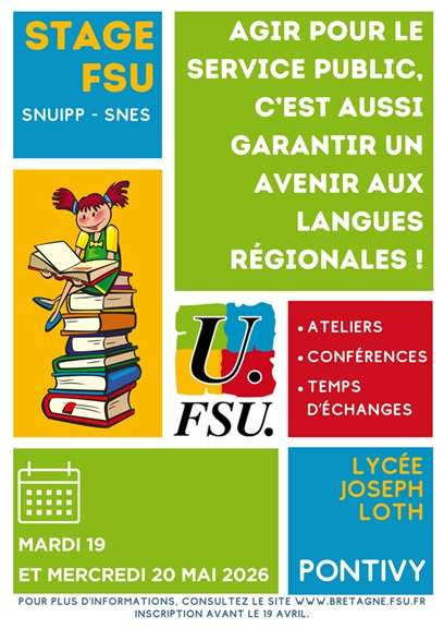Agir pour le service public, c’est aussi garantir un avenir aux langues régionales ! Stage syndical SNUipp, SNES et FSU Bretagne à Pontivy les 19 et 20 mai 2026