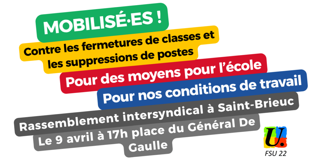 Ces organisations appellent les personnels, parents et élu·es à un rassemblement le jeudi 9 avril à 17h devant la Préfecture de Saint-Brieuc en amont du CDEN de repli.
